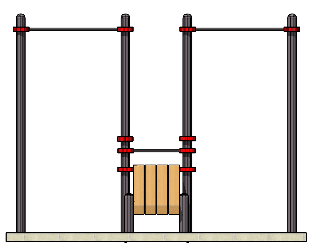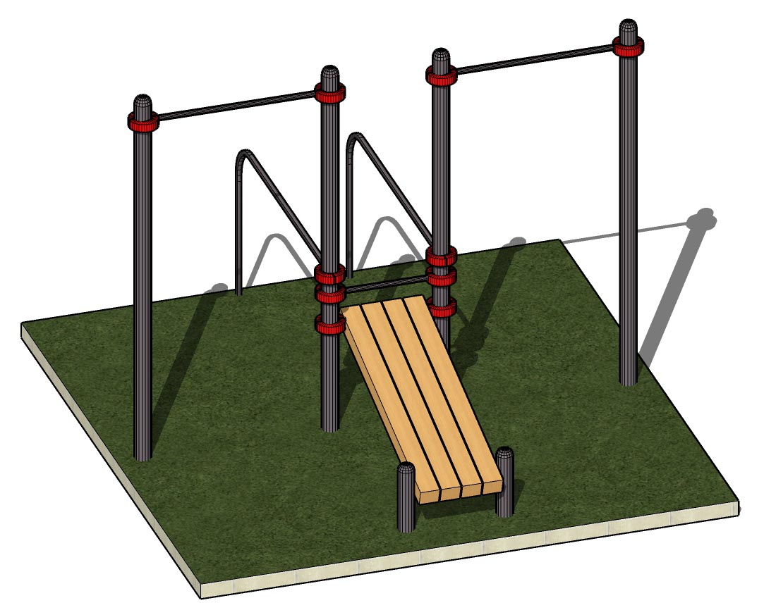 К опорным столбам высотой 2600мм крепится перекладина турника длинной 1200 мм на высоте 2400 мм и шведская стенка. Шведская стенка шириной 1200 мм, ширина секции 340 мм. Скамья для пресса фиксируется на высоте 1300 мм при помощи хомутов. Скамья для пресса представляет собой брус сечением 1800*450*45 мм. Общая длина комплекса составляет не более 3100 мм.